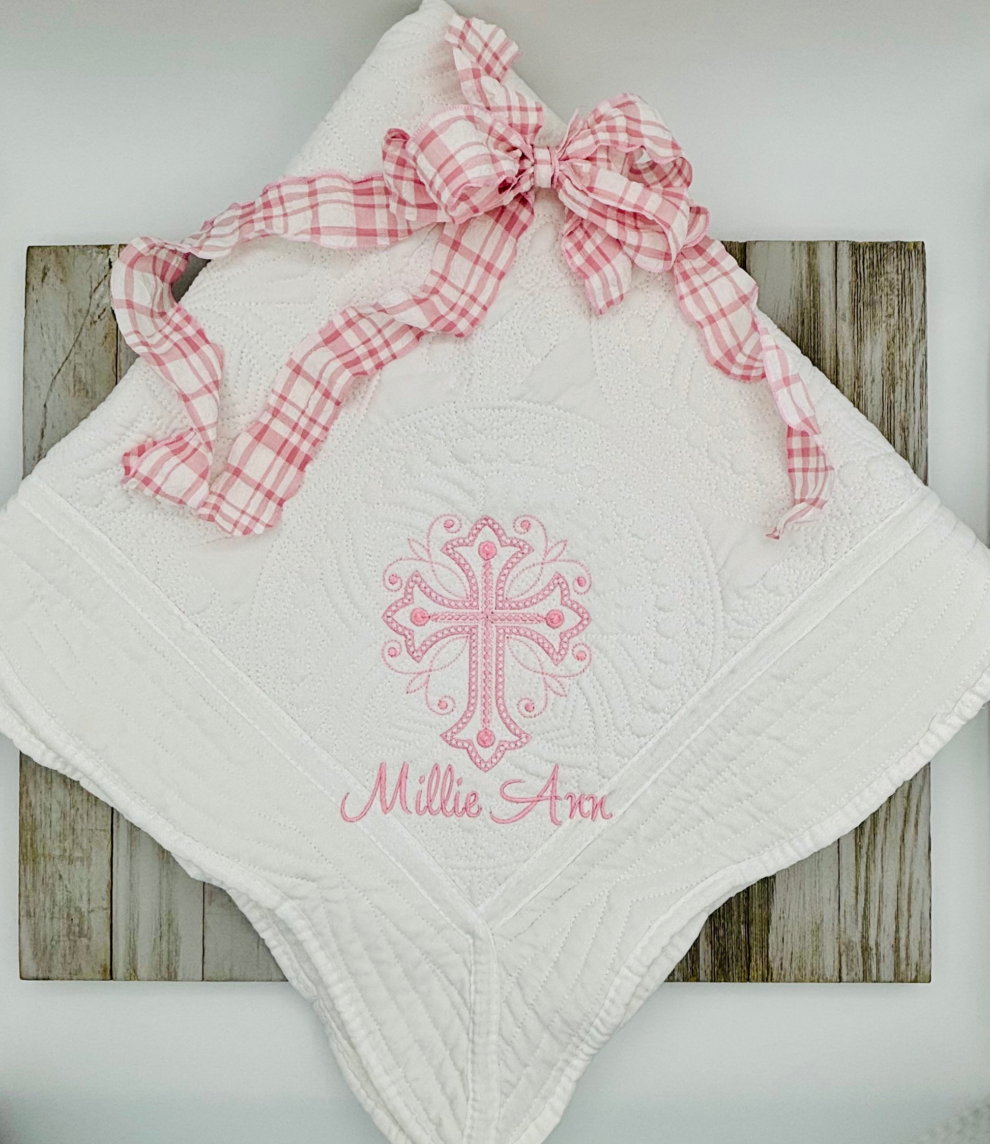 Simple Elegance, embroidered heirloom quilt features Celtic cross , customized with name, multiple color options, suitable for boy or girl just choose appropriate thread color